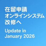- Online Residence Application System to Be Updated in January 2026/在留申請オンラインシステム改修へ|令和8年1月から添付容量拡大・一時保存機能を追加更新: 2025-11-06 日本語 English 【お知らせ】在留申請オンラインシステムが令和8年1月に改… 続きを読む: Online Residence Application System to Be Updated in January 2026/在留申請オンラインシステム改修へ|令和8年1月から添付容量拡大・一時保存機能を追加